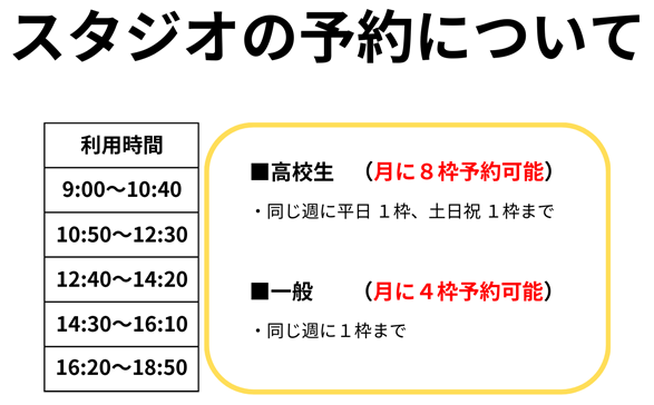 空き状況は、ホームページまたは ♢スタジオ予約状況♢ 退出の際は移動した機材は元に戻し、忘れ物がないように確認をお願いします。